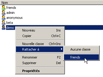 La création d'une classe est similaire à la création d'un compte utilisateur (voir au dessus). Pour rattacher un compte à une classe, selectionnez-le, avec la souris/bouton droit, selectionnez "Rattacher à" puis le nom de la classe.
